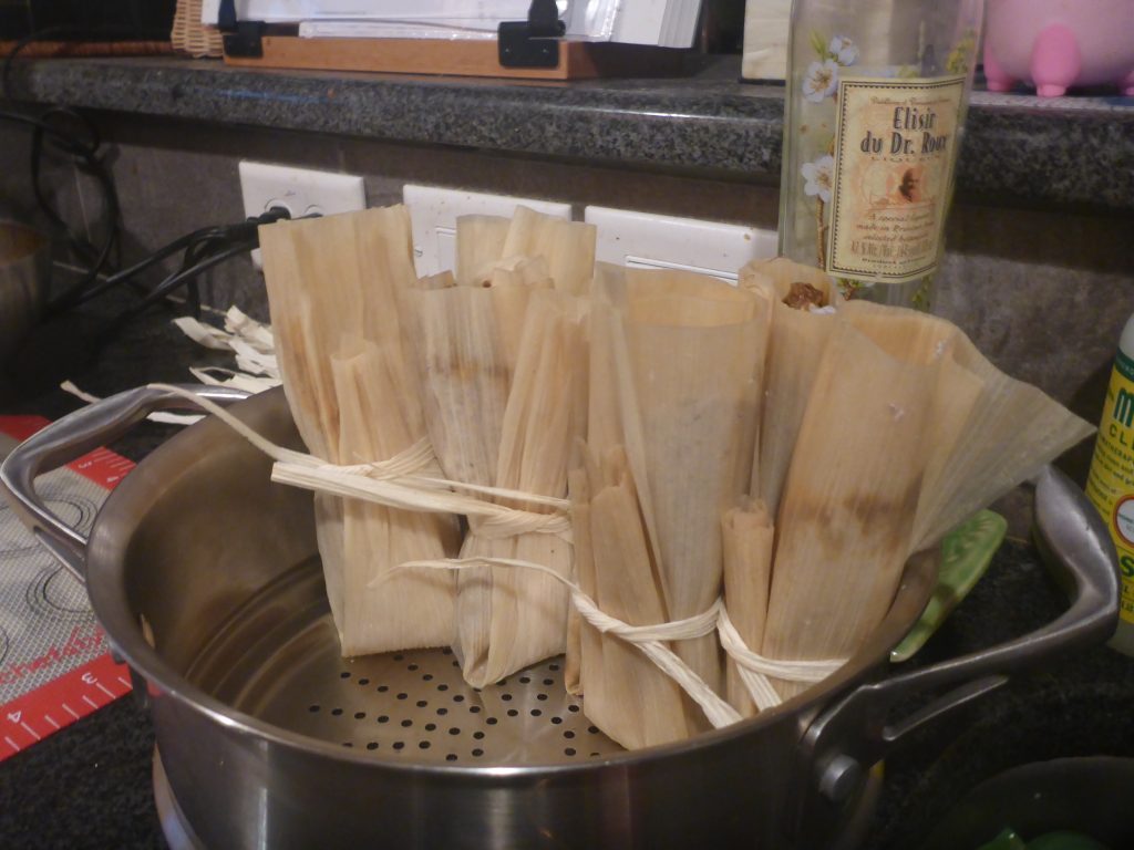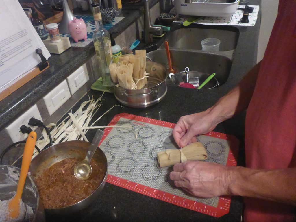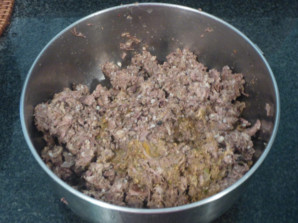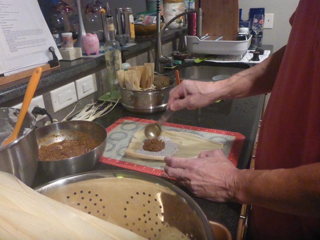 After boiling the scrap for the stocks I separate the meat from the sinew and end up with meat similar in texture to what is used traditionally in tamales. This is combined with the Mexican spiced red chili sauce and formed into tamales.